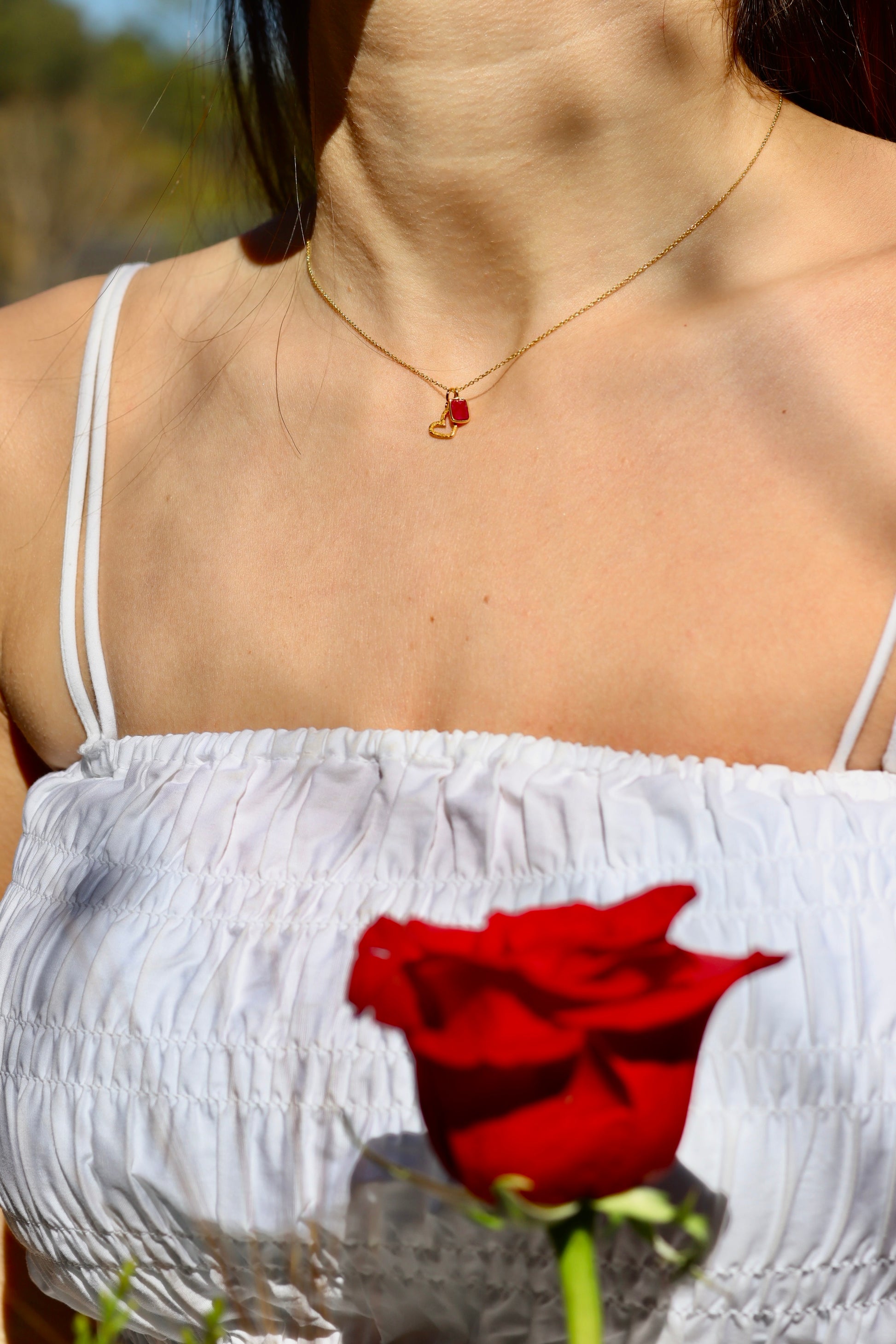 Collaret de cadena amb cor i mineral penjant simulant la sang del drac i el color de l'amor